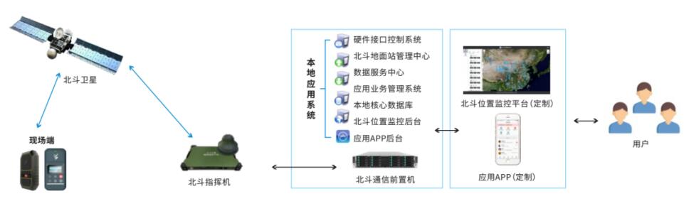 ① 中心端軟硬件系統(tǒng)包括1-北斗指揮機、2-北斗衛(wèi)星收發(fā)單元,3-本地應用系統(tǒng)、4-北斗RDSS專用服務器、5-北斗監(jiān)控平臺與APP五大部分組成;