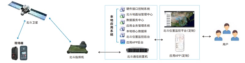 中心端軟硬件系統(tǒng)包括:1-北斗指揮機(jī),2-北斗衛(wèi)星收發(fā)單元,3:本地應(yīng)用系統(tǒng),4-北斗RDSS專用服務(wù)器,5-北斗監(jiān)控平臺與APP五大部分組成。